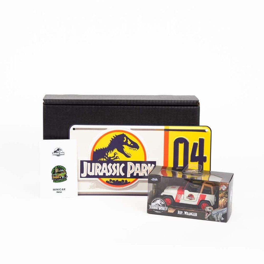 El regalo perfecto para fans de Jurassic Park.Una caja regalo con el mítico Jeep Wrangler en miniatura y otros iconos de la aventura jurásica.