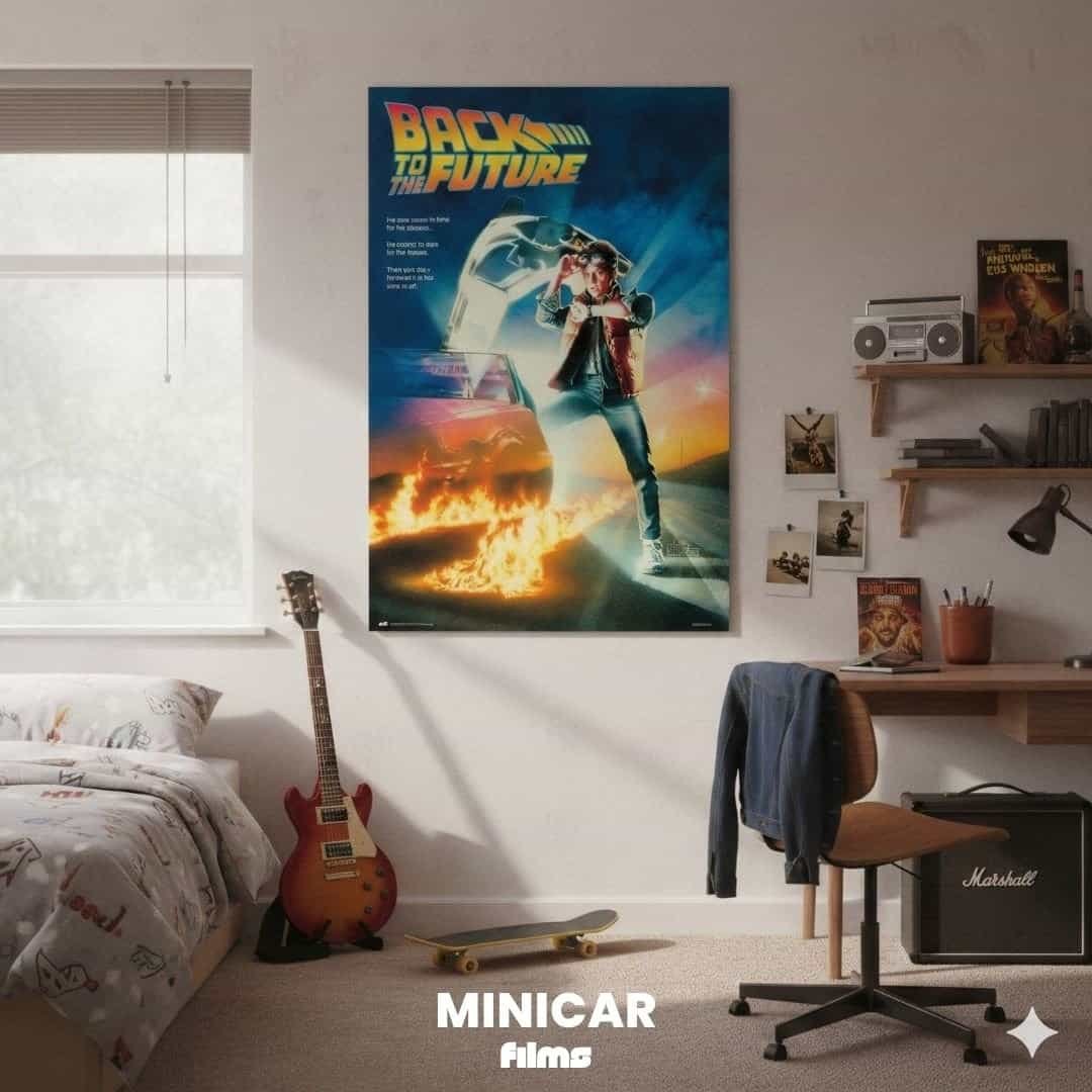 Este diseño corresponde específicamente a la Parte I (1985). Se distingue porque solo aparece Marty McFly junto al coche. Los pósters de la Parte II incluyen a Doc Brown, y los de la Parte III suman a Clara Clayton. Es el diseño más puro y clásico de la saga.